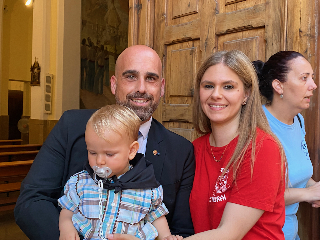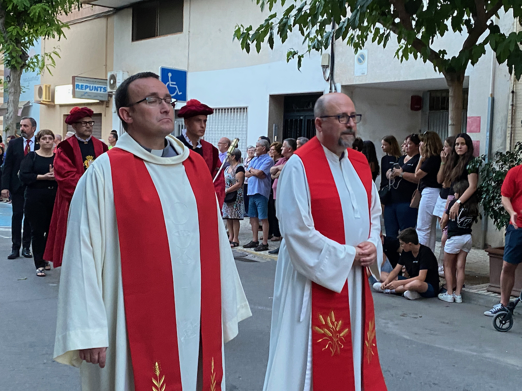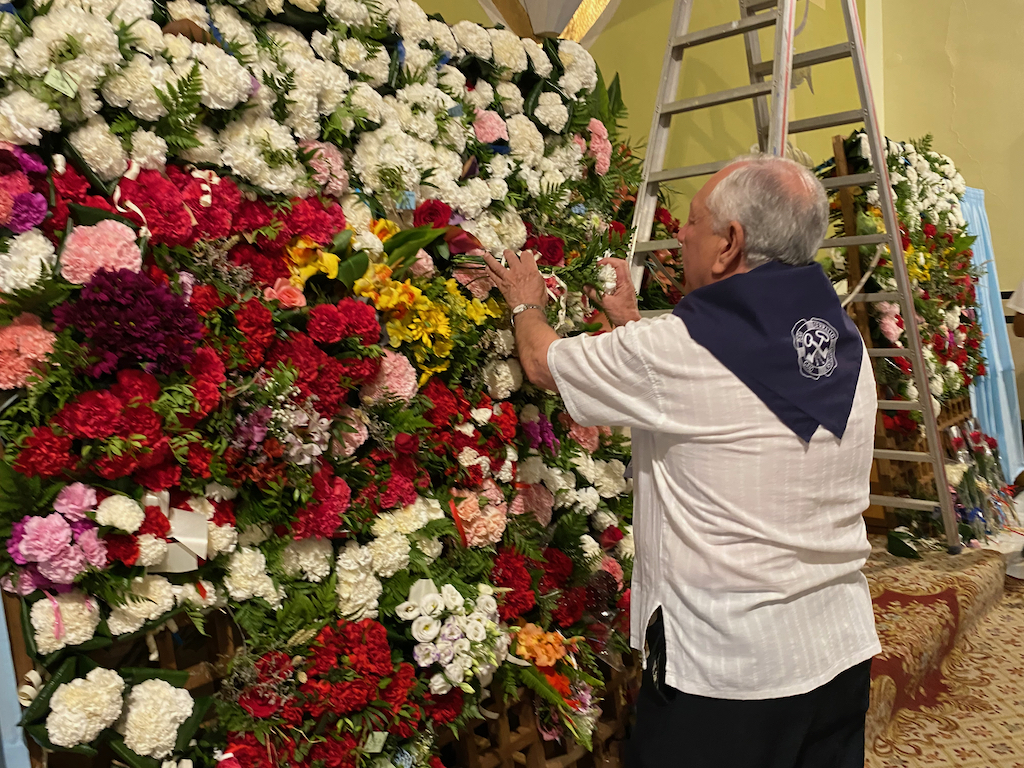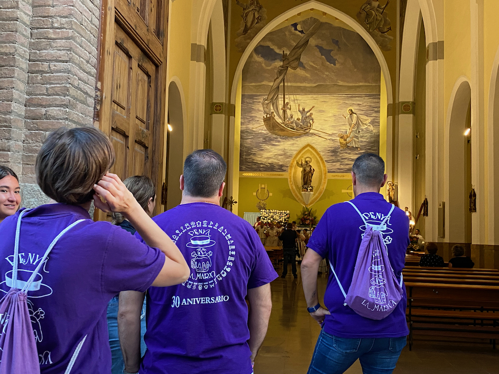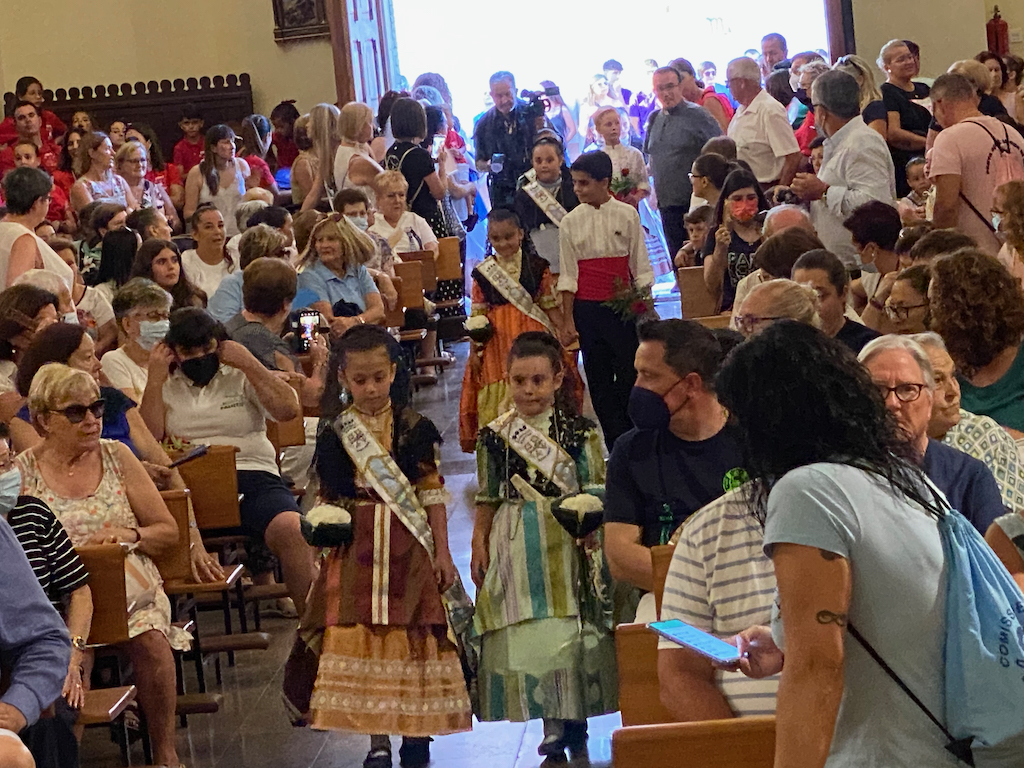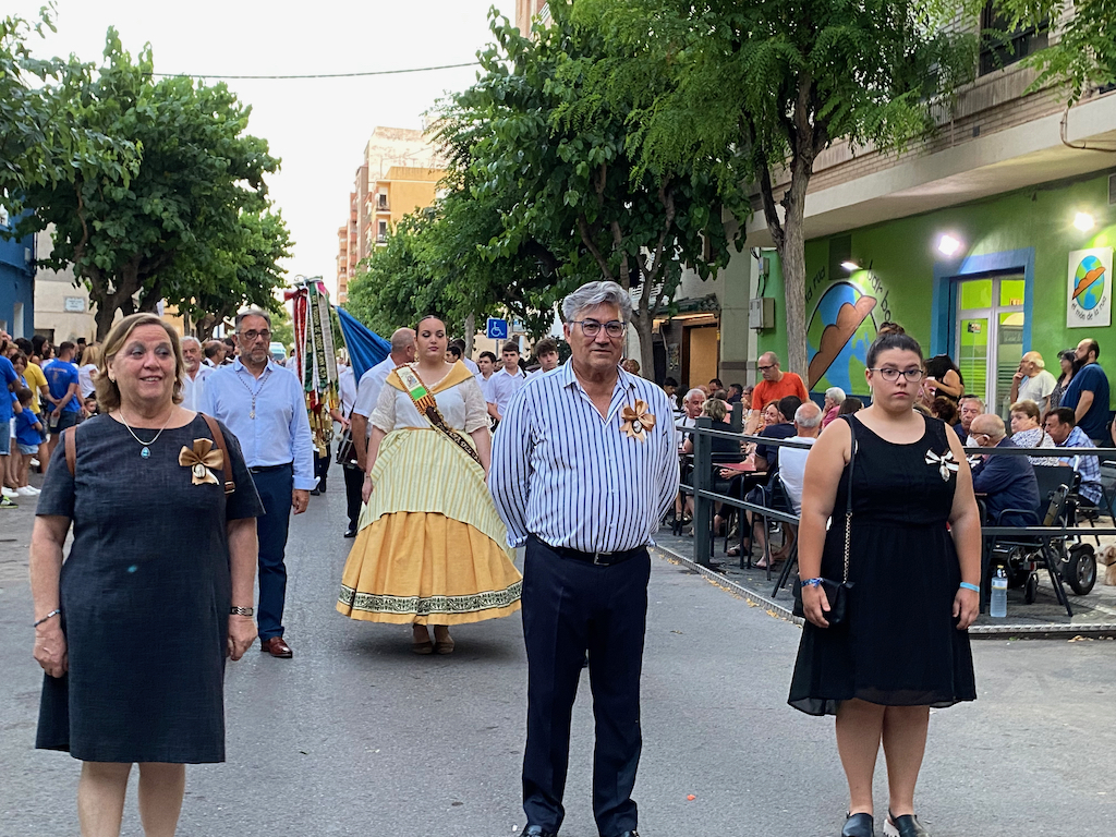 La Comitiva se desplazó desde la Tenencia de Alcaldía del Grau hasta la parroquia de Sant Pere, sonde se componían los paneles de flores dedicados al santo. Las reinas del Grau y la Comisión de fiestas besaron sus ramos de flores antes de entregarlos para confeccionar la ofrenda.