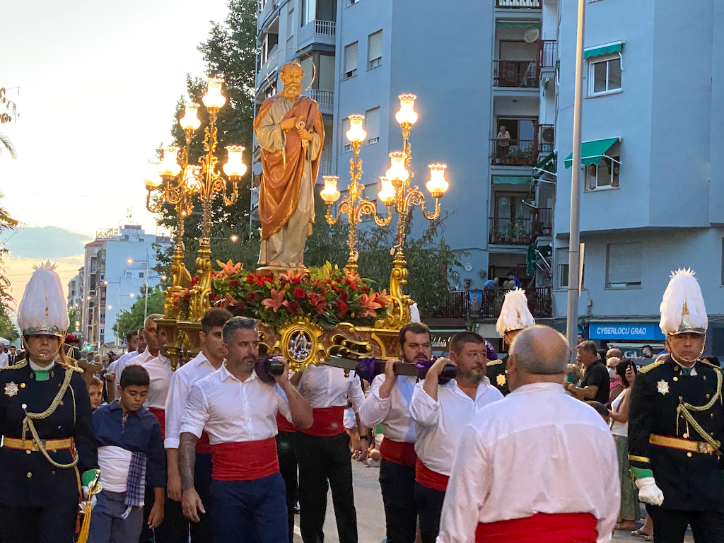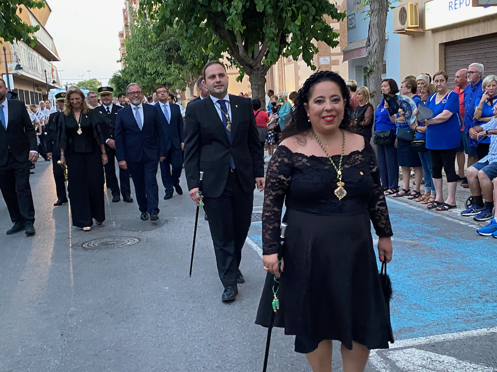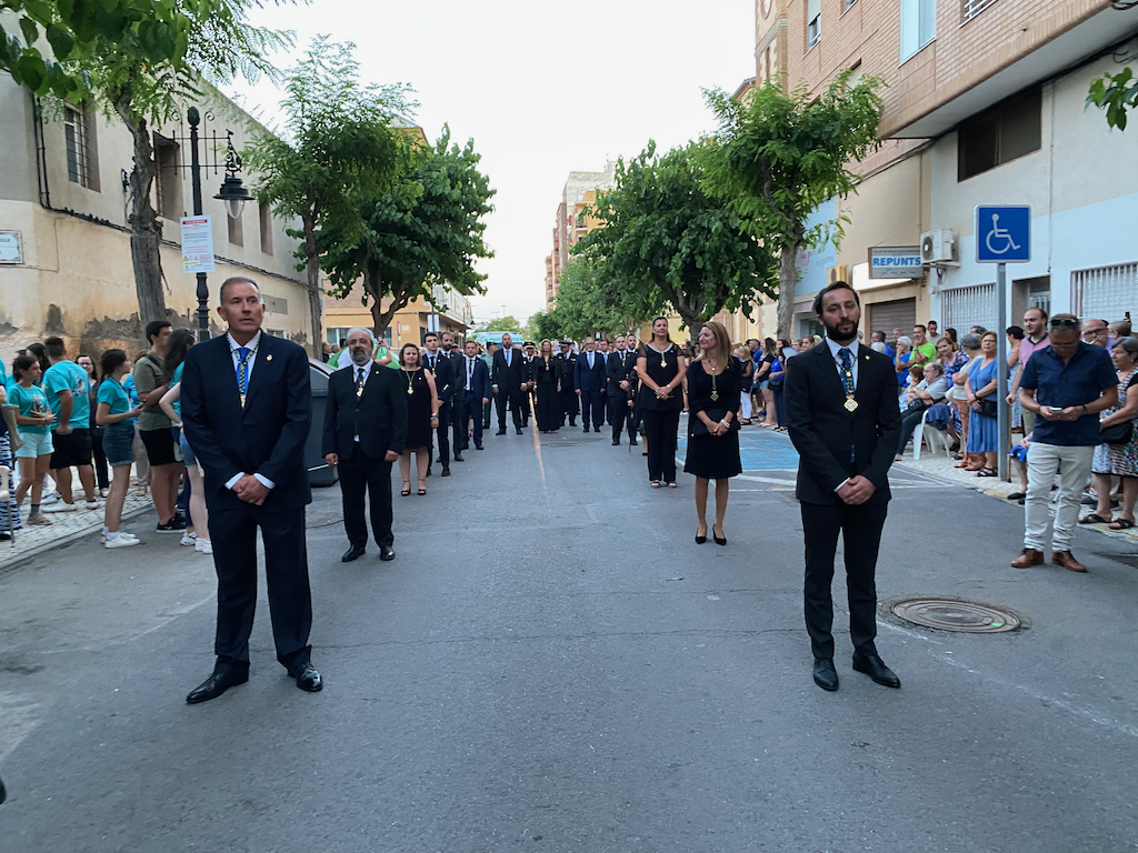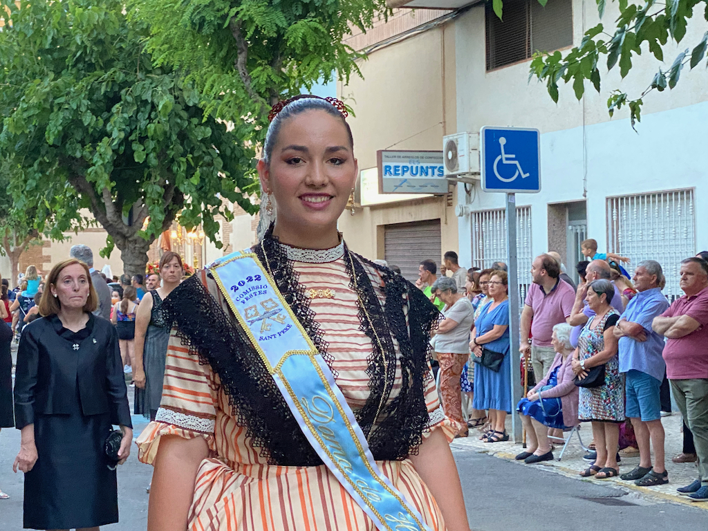 Después lo haría la imagen de Sant Pere, también con vivas y aplausos. En la puerta de la iglesia se compuso el resto de la procesión. Primero las damas del Grau con la banda del Distrito Marítimo.