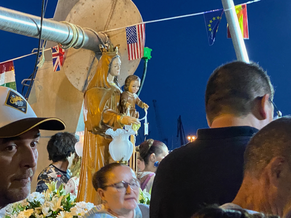La nave de la Virgen del Carmen fue la primera en soltar amarras, después lo hizo la de Sant Pere, y tras esta, la de las autoridades. Otras embarcaciones de recreo y de pesca, acompañaron a la procesión mientras recorría la dársena pesquera y luego la dársena interior del Puerto.