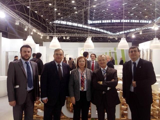 Calpe, Granell y Solá se han acercado hasta el salón internacional de la cerámica, donde han conversado con los responsables de la mercantil burrianense Sanycces