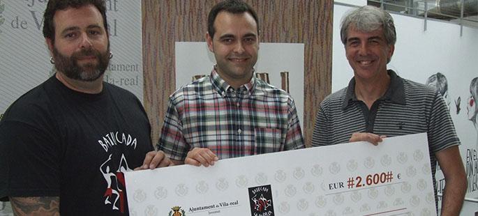 El concejal de Juventud del Ayuntamiento de Vila-real, Xavi Ochando y Sanjo Sambalea, de Sambalea Percussións, han entregado al presidente de la penya Cèltic Submarí, Ernesto Boixader, un cheque por valor de 2.600 euros recaudados en el I Encuentro Solidario de Batucadas, celebrado el pasado sábado.