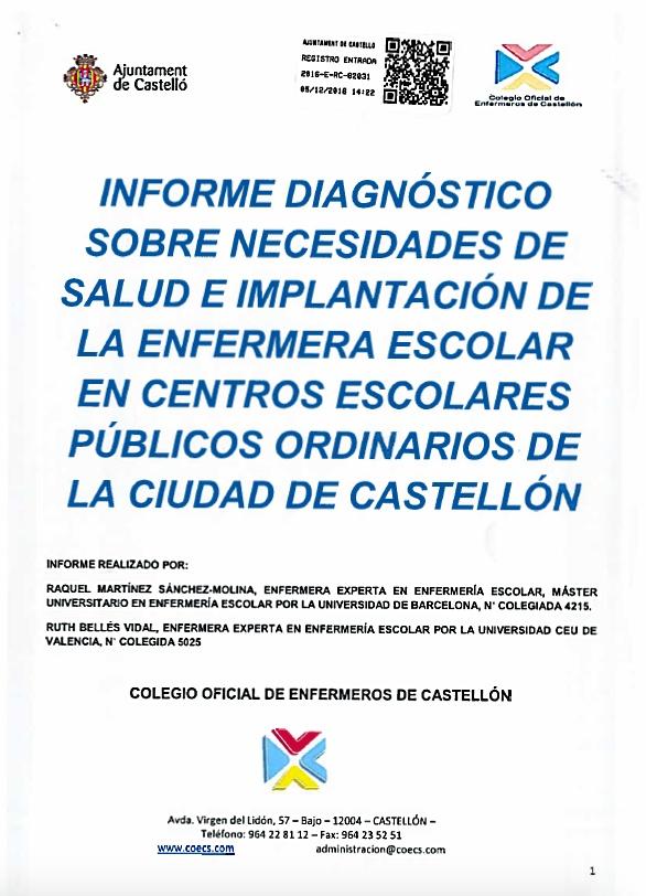 En 2016 el Ayuntamiento de Castelló firmó un convenio con el Colegio de Enfermería para la elaboración de un informe sobre la necesidad de la enfermería escolar en los colegios de la capital de la Plana.