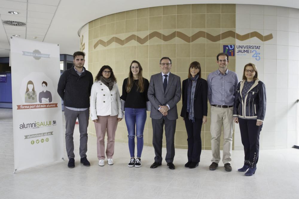 Vicent Climent, rector de la Universitat Jaume I; Iván Barreda, vicepresident de la Societat d'Amics i Antics Alumnes de l'UJI, Inmaculada Fortanet, secretària de la Societat d'Amics i Antics Alumnes de l'UJI i vicerectora d'Internacionalització, Cooperació i Multilingüisme, i Pilar García Agustín, vicerectora de d'Estudiants, Ocupació i Innovació Educativa han fet entrega de quatre ajudes de 781 euros per a cursar estudis oficials de postgrau a la Universitat Jaume I.