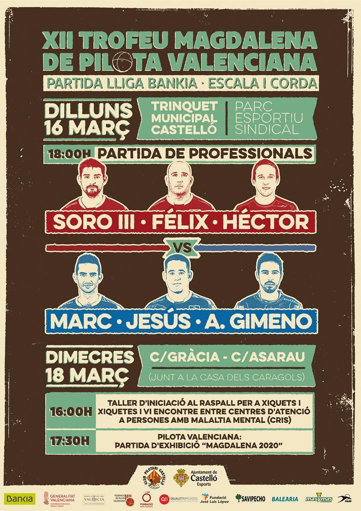 La primera cita del calendari del XII Trofeu Magdalena de Pilota Valenciana tindrà lloc el dilluns 16 de març a les 17.30 hores en el Trinquet Municipal de Castelló amb la partida de la Lliga Bankia que enfrontarà a l'equip de Soro III, Félix i Héctor amb el trio format per Marc, Jesús i A. Gimeno.