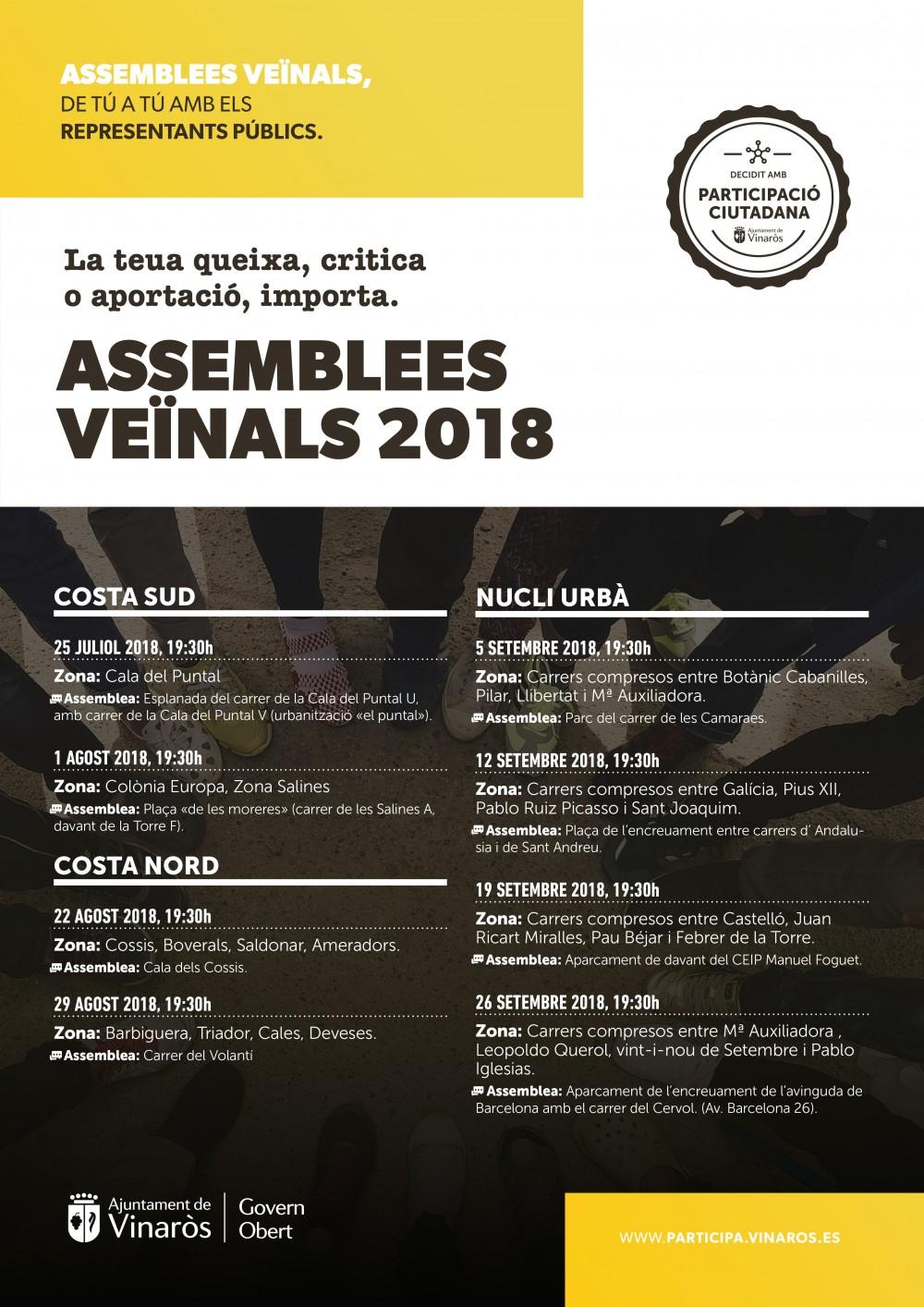 Les assemblees començaran a la costa Sud el 25 de juliol a la zona de Cala Puntal, per després continuar el dia 1 d'agost a la Colònia Europa i la zona de les Salines. Per a l'agost les reunions es faran a la costa Nord, primer el dia 22 a la platja del Cossis i en segon lloc el dia 29 al carrer del Volantí. Al mes de setembre les assemblees arribaran al nucli urbà, el dia 5 al Parc de les Camaraes, el 12 a la plaça de l'encreuament entre els carrers d'Andalusia i de Sant Andreu, el 19 davant del col•legi Manuel Foguet, mentre que el dia 26 acabaran les reunions amb els veïns a l'avinguda Barcelona.