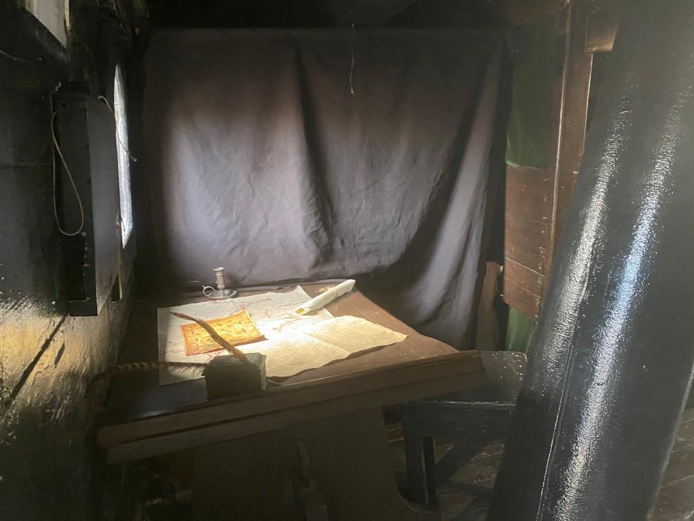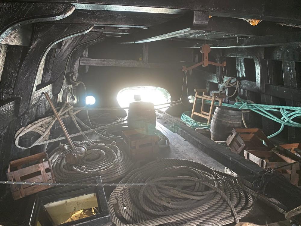 Llama la atención el ‘winch’ de madera, con el que se articulaban las velas y otros aparejos, con los agujeros donde se insertaban los palos empujados por la tripulación para poder utilizarlo como polea.