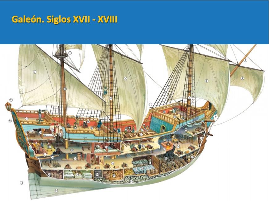 Los Galeones: Tras el descubrimiento de América y después, la navegación oceánica, el comercio y la guerra, las naves evolucionaron también hasta convertirse en galeones. Barcos más grandes, habilitados para la tripulación y el pasaje, con mayor espacio en las bodegas, más velas pero más pequeñas, habilitados para largas travesías.
