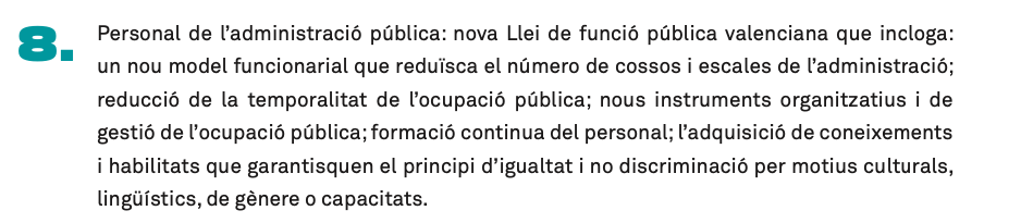 El principal cavall de batalla d’Escola Valenciana és actualment, aconseguir eixe requisit lingüístic en la funció pública. Què significa això? doncs el dret de la ciutadania a ser atesos en la llengua oficial i pròpia. Tècnicament, el segon acord del Botànic va potenciar aquest fet tant en el punt 8 com en el punt 14 de l’acord. Escola Valenciana troba a faltar aquesta iniciativa en l’administració valenciana: “Per què no es pot parlar en valencià d’economia o de lleis?”, es pregunta el president de la entitat.