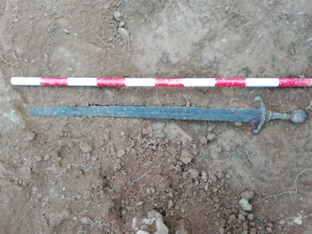 Este año se ha llevado a cabo la segunda fase del proyecto y la excavación arqueológica, bajo la dirección de Vicente Vivó Agulló, ha desvelado una habitación de mayores dimensiones que las anteriores, con suelo de mortero, una zona de hogar y un banco obrado. Es aquí donde se ha realizado el hallazgo de la espada, de 94 cm de longitud, con una cruz de 13 cm y pomo esférico. En la empuñadura encontramos dos aretes de bronce remachado a modo de virola, que rodean la espiga y en la hoja se aprecia una acanaladura central. Por su tipología y contexto arqueológico la pieza se fecharía en el siglo XIV y seguramente se conservó a consecuencia de la destrucción del castillo durante la Guerra de los Dos Pedros (1356-1367).