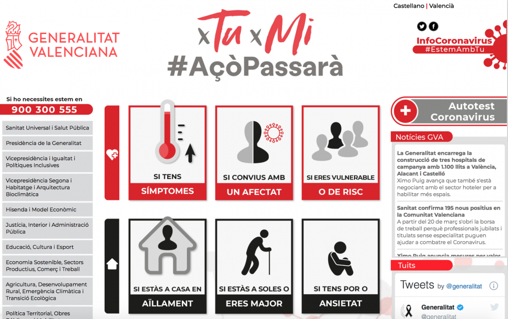 La pàgina destaca, en lloc preeminent, el telèfon d'informació de la Generalitat Valenciana per aquelles persones que tinguen una consulta sobre el coronavirus, el 900 300 555. També enllaça directament amb l'Autotest del Coronavirus habilitat per la Conselleria de Sanitat Universal i Salut Pública.