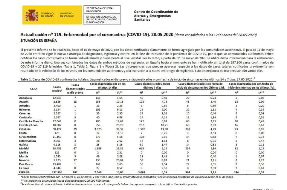 La mayor parte de las infecciones se han registrado otro día más en Madrid (67) y Cataluña (39). En total, 237.906 personas han dado positivo por la enfermedad. El número de positivos notificado en la Comunidad de Madrid y Barcelona representan el 58% del total del país. Ayer suponían el 75%, es decir, tres de cada cuatro.