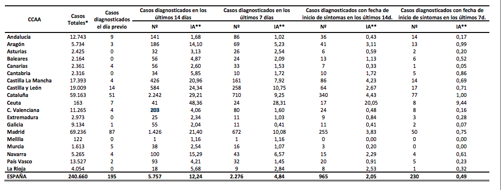 El informe recoge que se han producido 195 contagios en las últimas 24 horas, frente a las 219 del día de ayer, 26 menos este jueves. Así, el total de positivos se sitúa en 240.660. En la última semana han necesitado hospitalización 166 personas (124.227 en total), y se han producido 11 ingresos en cuidados intensivos (11.426 en total), la mayoría de ellos en Madrid, Cataluña y Castilla y León.