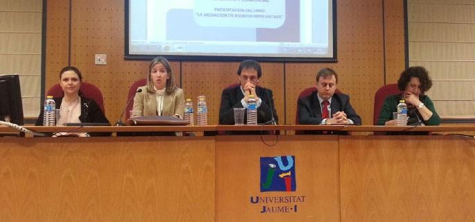 Especialistas en el ámbito mercantil han abordado durante una jornada en la UJI las distintas perspectivas de la mediación mercantil, una figura que junto al arbitraje, constituye una de las medidas de resolución alternativa de conflictos. La jornada organizada por el Departamento de Derecho Público de la Universitat Jaume I ha contado con la colaboración del Colegio de Registradores de España, el Colegio de Abogados de Castellón y el Colegio de Economistas de Castellón, así como de la editorial Tirant Lo Blanc.