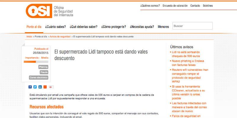La cadena de supermercados Lidl ha notificado la existencia de una campaña de promociones falsasque utiliza cheques regalo como reclamo, con el fin de obtener información personal de los usuarios que caigan en la trampa. Los usuarios que hayan respondido a la campaña, podrían verse suscritos a servicios que no desean