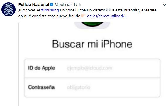 La Policía Nacional ha emitido una alarma, a través de página de Twitter, donde alerta de los intentos de estafa por el método del 'phishing unicode' para los usuarios de Icloud y Apple, por parte de suplantadores, para hacerse con sus datos de identidad.