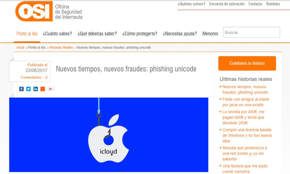 Durante estos días, La Oficina de Seguridad para el Internauta (OSI) ha puesto sobre la mesa una nueva modalidad de Phishing unicode, dirigido, fundamentalmente a los usuarios de Apple.