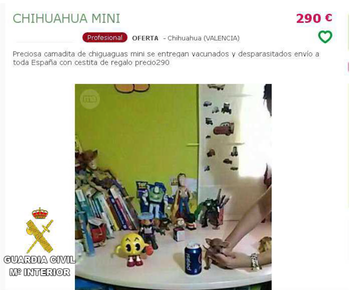 La Guardia Civil ha investigado a una persona, como supuesta autora de un delito de estafa por la venta de cachorros enfermos de raza chihuahua a través de Internet, otro delito de falsedad documental y otro de intrusismo. La actuación se inició a raíz de una denuncia presentada en la Comandancia de la Guardia Civil de Castellón, donde una persona informaba que a principios de año había realizado la compra de un perro de raza chihuahua a través una conocida página de anuncios de Internet, tras recogerlo en la localidad de Albal (Valencia), el can presentaba síntomas de enfermedad, teniendo que quedar ingresado en un centro veterinario por gastroenteritis hemorrágica asociada a coccidiosis, falleciendo finalmente.