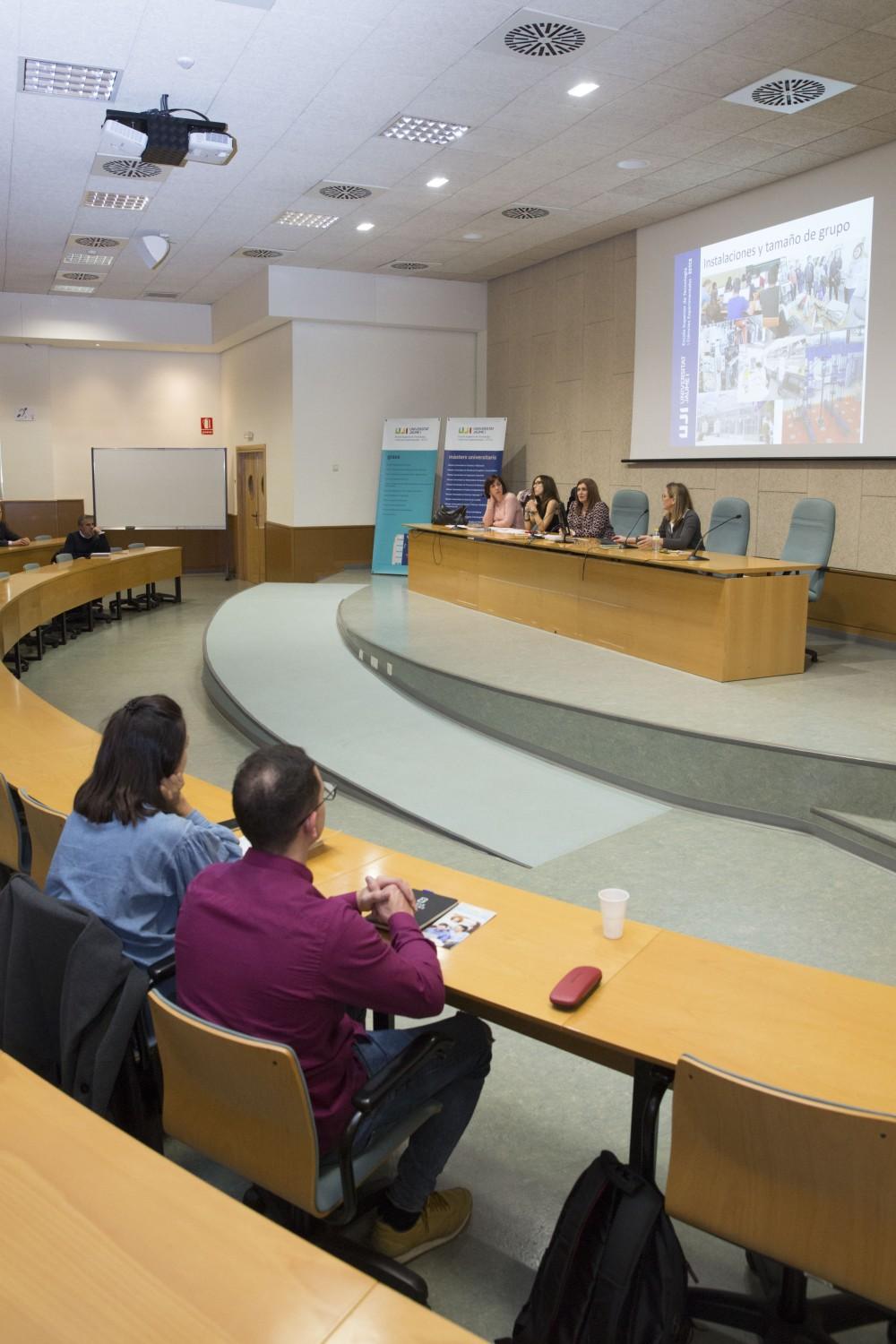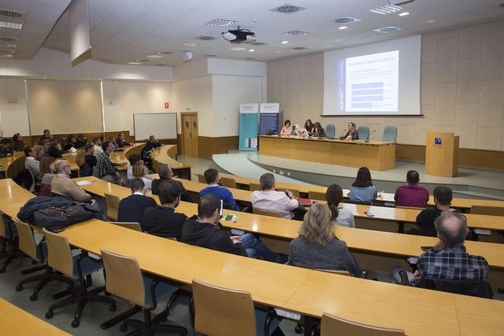 L'acte de presentació de la fira ha comptat amb la participació de la directora de l'ESTCE, Amelia Simó, acompanyada per les dues vicedirectores de gestió d'aquest centre, Mª José Aramburu i Ana Piquer, i la responsable de l'Oficina d'Inserció Professional i Estades en Pràctiques de l'UJI, Maribel Beas, qui han realitzat una breu explicació dels estudis de grau i màster que s'imparteixen a l'ESTCE i les activitats previstes per la fira.