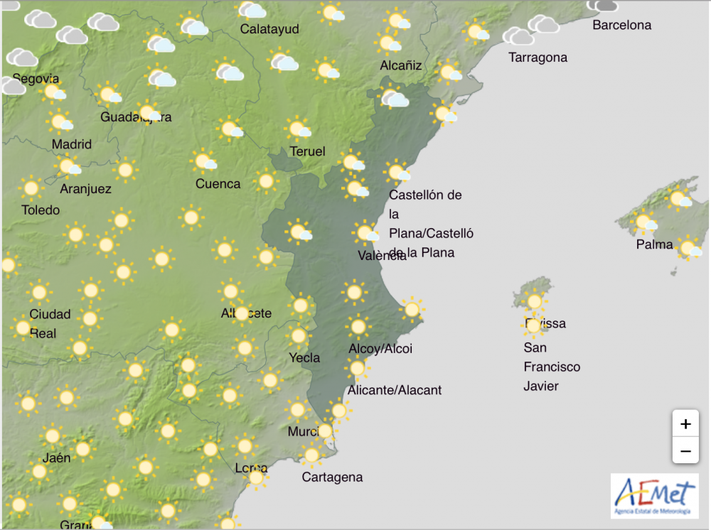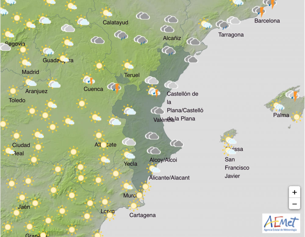 Aemet prevé que mañana lunes el cielo continue nuboso pero alrededor de las 15.00 empezará lucir un poco el sol, sobre todo en el litoral de la provincia y las temperaturas serán de unos 15ºC en la costa y alrededor de los 10ºC en el interior. Respecto al viento, habrá rachas de hasta 20 km/hora en algunos momentos y habrá probabilidad de tormentas de un 20% en el norte y en la costa sur pero de un 45% en el interior sur de Castellón.