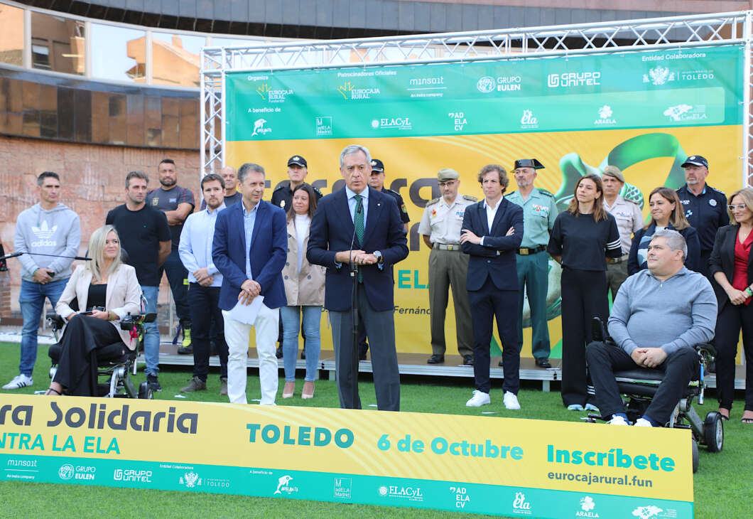 El concejal de Medioambiente, Río Tajo y Deportes del Ayuntamiento de Toledo, Rubén Lozano, indicó que "ahora mismo el deporte está muy vinculado a la solidaridad, a la salud, y tenemos una nueva ley. La ELA avanza, pero yo creo que es importante que nosotros también avancemos, y más rápido si cabe. Gracias a iniciativas como ésta, yo creo que podemos soñar con tener una solución médica. Yo creo que es cuestión de tener fondos, de tener investigación, de implicarse y nada mejor que esta carrera, que cada año suma más entidades a nivel nacional, más patrocinios y más apoyos, pues sin duda va a ser un referente nacional. Desde el Ayuntamiento de Toledo me consta que más de uno estaremos con el dorsal, corriendo y apoyando, así que muchísimo ánimo y a seguir".
