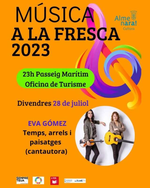 Divendres que ve 28 de juliol, dins del cicle Música a la Fresca, la cantautora d'Almenara, Eva Gómez, presentarà en societat el seu nou disc titulat "Temps, arrels i paisatges...". La cita serà a les 23 hores en el Passeig Marítim de la Platja Casablanca d'Almenara, al costat de l'Oficina de Turisme.