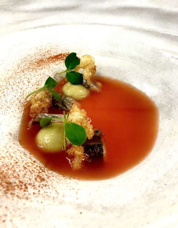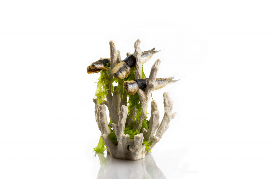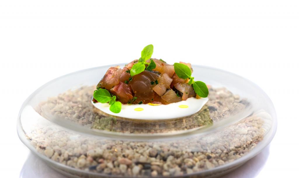 Con capacidad para 22 comensales, el restaurante ofrece un único menú degustación enfocado exclusivamente a productos del mar. Este consta de 13 platos, entre los que se incluyen boquerón de la luz escabechado, lluenta, caballa marinada, ‘canana’, rape tibio semicurado o arroz cremoso de navajas. El precio es de 94 euros.