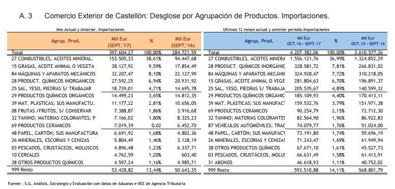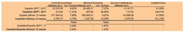 Las exportaciones de mercancías de la provincia de Castellón han alcanzado  los 510,94 millones de euros, lo que supone un incremento del 11,22% respecto al mismo mes de 2016. Así viene recogido en el último informe de Comercio Exterior publicado hoy. Por otro lado, en lo que se refiere a importanciones de la provincia, el saldo también es positivo y supera ampliamente a las cifras anteriores, alcanzan un 39,65% más que durante el mismo mes de setiembre de 2016, situándose en un total de 397,60 millones de euros.