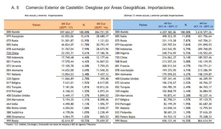 Centrado la atención en las importaciones,  el gran peso del petróleo debido a la existencia de la refinería, se traduce en que los primeros puestos suelen estar ocupados por países productores de petróleo. Este mes acupan los primeros cinco puestos  Kazajstán, Rusia, Italia, Azerbaiján, y China.