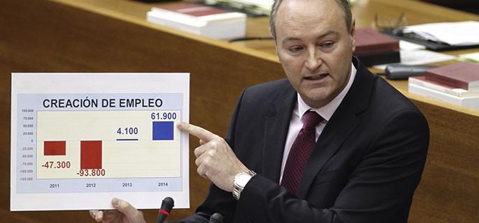 Una afirmación que se sustenta, según ha explicado el jefe del Consell, en los indicadores económicos que indican que la economía valenciana ha pasado de decrecer un 2,9% en 2012 a una previsión del 2,7% en 2015. En definitiva, una recuperación de 5,6 puntos del PIB en tan sólo 3 años. Además, tenemos la mitad de déficit que en 2011, "sin mermar los servicios públicos" y tenemos menos paro, con 52.600 valencianos desempleados menos que en 2011. Y solo en este 2014, "61.900 familias valencianas han encontrado un nuevo empleo".