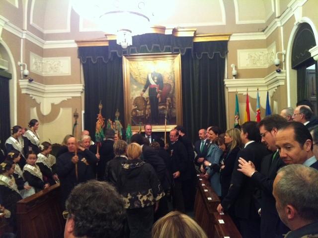 El salón de actos presentaba el aspecto de las grandes solemnidades ocupado en su totalidad por representantes de las distintas Gaiatas, Corte de Honor de las reinas, la Bellea del Foc de Alicante y su Damas, así como las representantes de las Casas de Valencia en Barcelona y Zaragoza, que han recibido sus bandas de manos de la Reina de las Fiestas.
