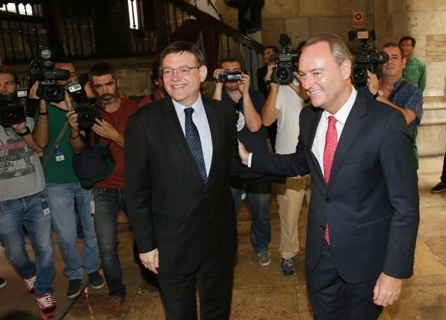 El presidente de la Generalitat, Alberto Fabra, ha recibido hoy al secretario general del PSPV-PSOE, Ximo Puig, en el Palau de la Generalitat para iniciar el traspaso de poderes de forma transparente, responsable y dentro de la normalidad democrática.