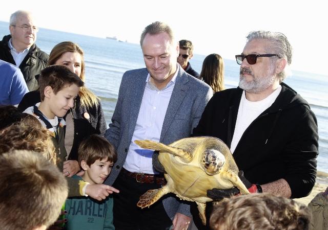 El president de la Generalitat, Alberto Fabra, ha agradecido la gran labor realizada por el Centro de Recuperación 'La Granja' de El Saler y por el Arca del Mar en L'Oceanogràfic en la recuperación de tortugas marinas durante la suelta de 4 ejemplares en la playa del Pinar de Castellón.