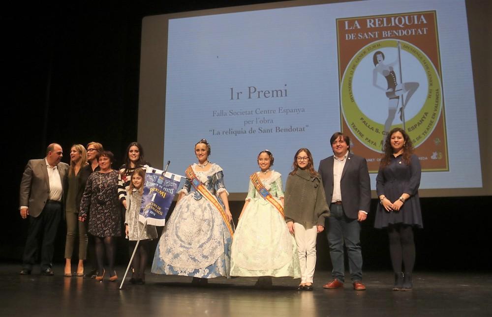 La Falla Societat Centre Espanya s'ha convertit en la gran triumfadora del XII Concurs de Teatre en Valencià que cada any se celebra a Borriana durant les setmanes prèvies a les Falles de Sant Josep. Fins a sis vegades van haver de pujar a l'escenari els i les representants de Centre Espanya per a arreplegar els diferents premis amb els quals va ser guardonada la seua obra 'La Relíquia de Sant Bendotat', que al final de la nit es va apuntar els premis de millor obra, millor direcció, vestuari, escenografia, actor principal i actriu de repartiment, el primer per a Vicente Cantos i el segon per a Carmen Goterris.