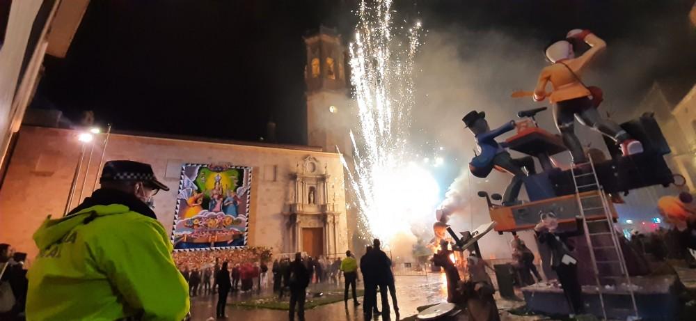 Tras ser muy descafeinadas en octubre, la ciudad a vuelto a vestirse de gala este mes de marzo y hoy ha culminado su actividad con una Cremà que ha transcurrido con total normalidad a pesar de algunas gotas que ha hecho sacar el paraguas a las comisiones falleras y que también ha molestado a la intervención de los bomberos en controlar el apagado de las llamas originados en los monumentos.