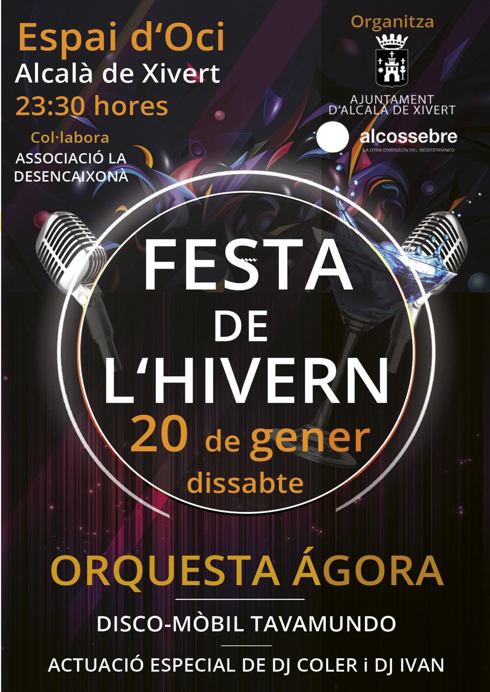 L'Ajuntament d'Alcalà-Alcossebre introdueix una nova cita al calendari festiu de la localitat: la Festa de l'Hivern que, a partir d'aquest any, se celebrarà al mes de gener, amb l'objectiu d'oferir als veïns de la localitat un motiu per reunir-se i tenir una nit festiva, aprofitant la proximitat amb dates de celebració com Sant Antoni. Aquest any, la festa tindrà lloc el dissabte 20 de gener, a partir de les 23.30h, a l'Espai d'Oci d'Alcalà, amb l'actuació de l'Orquestra Àgora i posterior discomòbil Tavamundo i discjòqueis DJ Coler i DJ Ivan. L'Associació La Desencaixonà col•labora en l'esdeveniment.