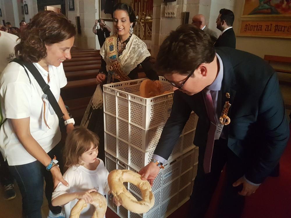 Sobre las 12 horas, la Romería ha salido hacia la iglesia parroquial, donde las autoridades y la reina y damas de las fiestas han procedido al reparto de los tradicionales 'Rotllos'. Cabe destacar que este año se han preparado 8.000 Rotllos. Los sobrantes se repartirán mañana 'Dia de la Dobla', en el que los participantes se reunirán para almorzar en los alrededores del paraje de San Cristóbal.