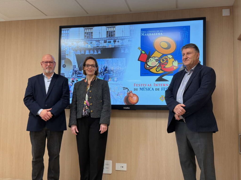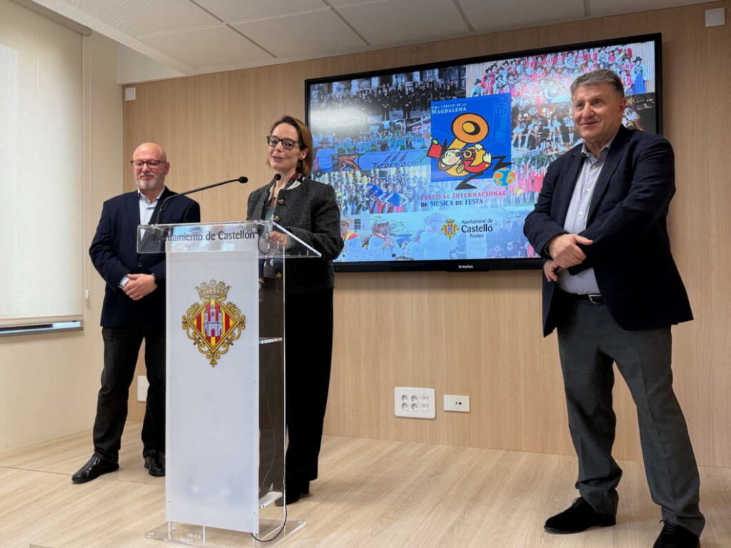 La concejal de Fiestas, Noelia Selma, y los miembros de la Junta de Fiestas, Jesús Medrano y Quique Masó han presentado esta mañana en el Ayuntamiento de Castellón uno de los secretos mejor guardados de la próxima Magdalena de 2025, que se celebrará en Castellón entre los días 22 y 30 de marzo: El Festival de Música Internacional de Fiesta para la Magdalena 2025