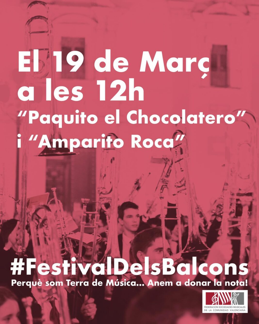 La Federación de Sociedades Musicales de la Comunidad Valenciana (FSMCV), con el apoyo de Eugeni Alemany, ha convocado a todos los músicos a sus balcones para interpretar los pasodobles 'Paquito el Chocolatero' y 'Amparito Roca' y llenar así las calles de música, en una acción conjunta como muestra de solidaridad y colaboración frente a esta situación de crisis sanitaria. La acción tendrá lugar mañana jueves 19, día de San José, a las 12:00 horas.