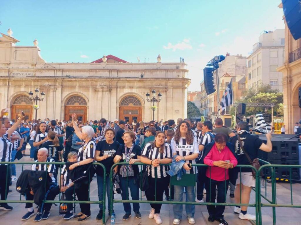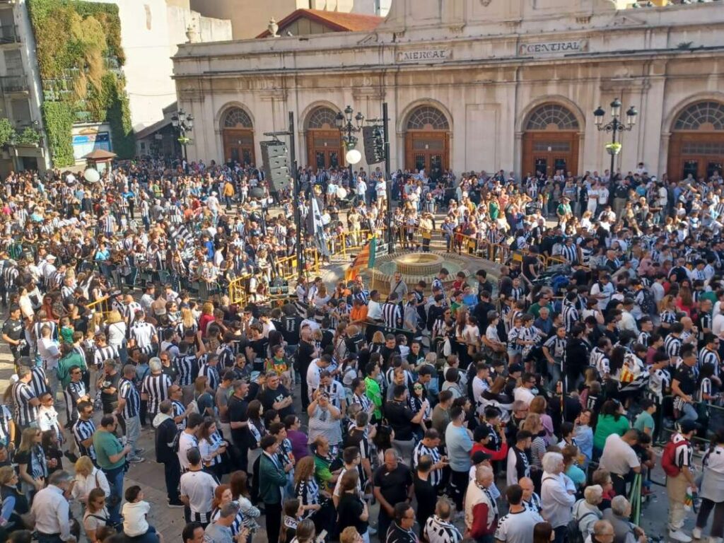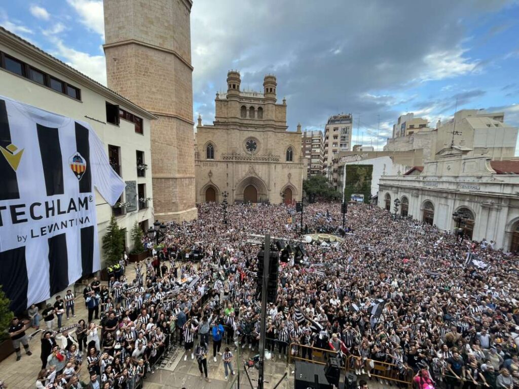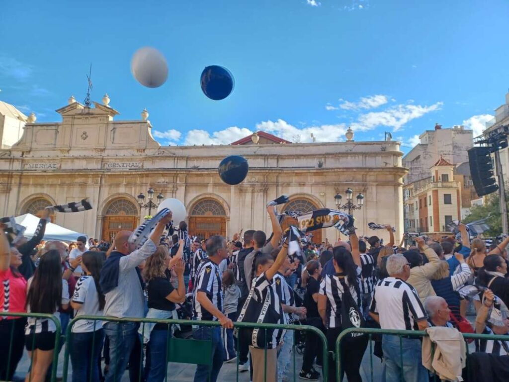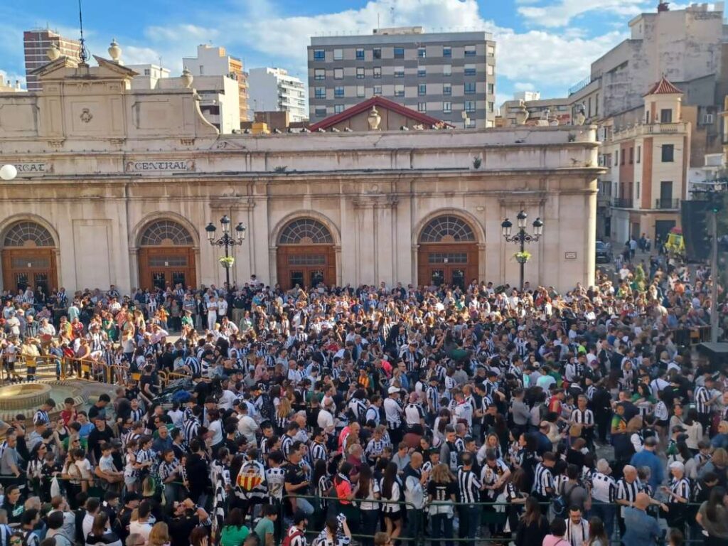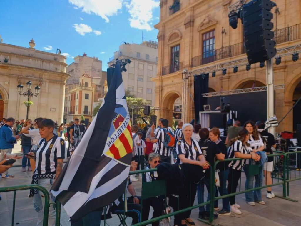 Día grande para los aficionados del CD Castellón. Día de celebraciones. Ambiente de gala en la Plaza Mayor, llena de camisetas albinegras. Locura y pasión por un equipo que la próxima temporada militará en el fútbol profesional