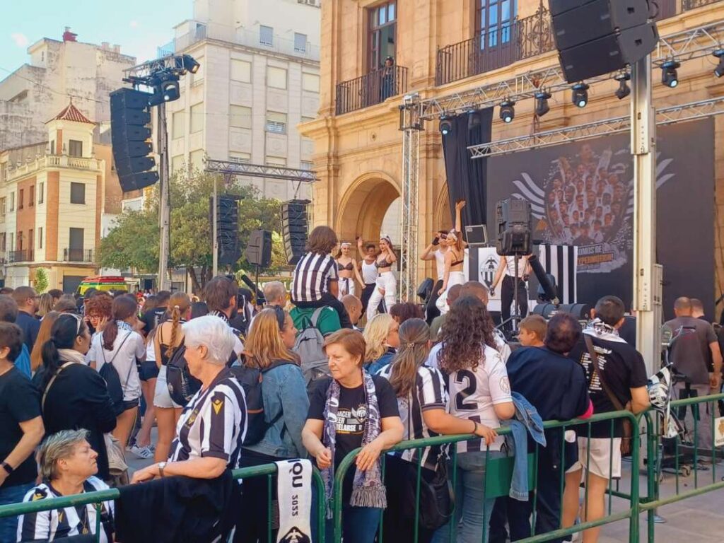 En la Plaza Mayor presidía una camiseta gigante junto al edificio del consistorio castellonense. Miles y miles de aficionados llenaron esa plaza donde hubo actuaciones musicales para ambientar la previa. A partir de las 17.00 horas ya había mucha gente instalándose cerca del pasillo por donde iban a pasar los futbolistas hasta llegar a las puertas del Ayuntamiento donde fueron recibidos por las autoridades.
