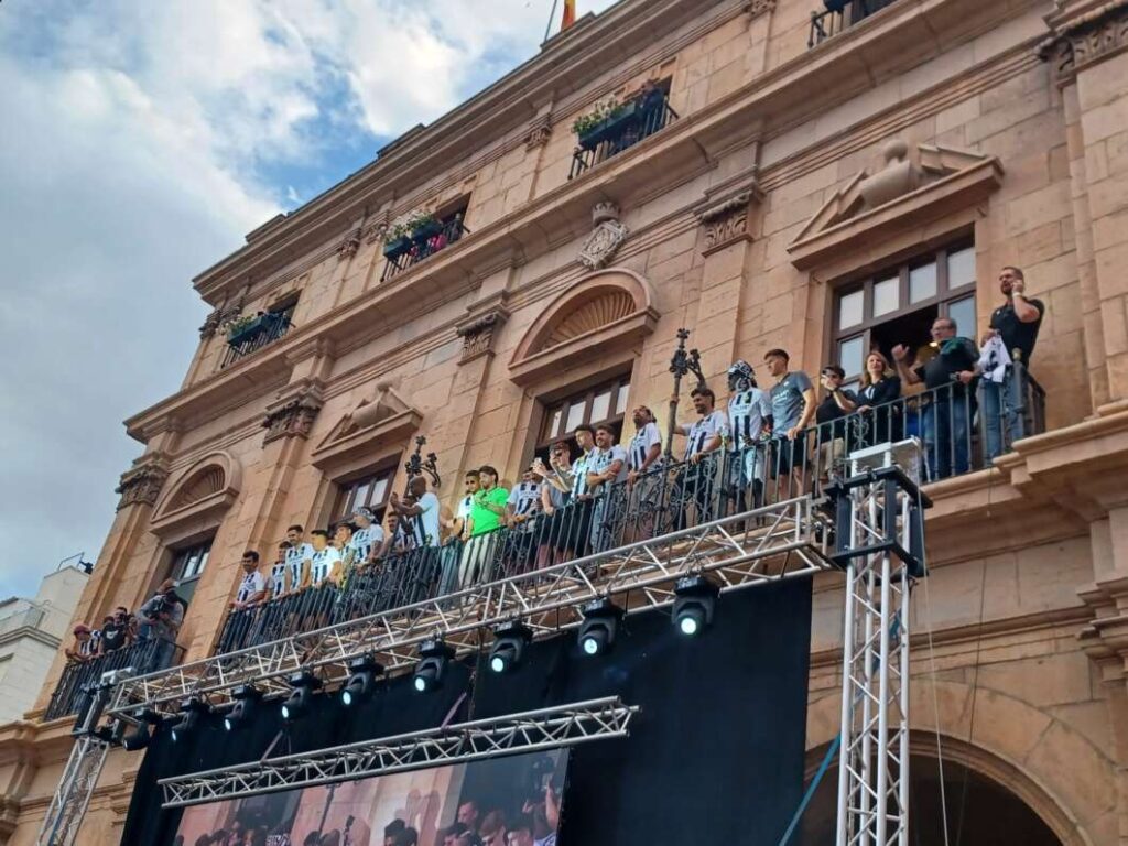 Tras los parlamentos pertinentes de la Alcaldesa, el presidente y el capitán, llegó el momento especial que salir todos al balcón del Ayuntamiento donde la legión de seguidores quería verlos a todos juntos. Habló desde el balón el técnico Dick Schreuder, muy emocionado. El portero Gonzalo Crettaz cogió el micrófono de ambiente y prácticamente durante todo el rato. Se lo arrebató Josep Calavera par arengar a la masa albinegra con una de las canciones del repertorio albinegro. También se arrancó Óscar Gil a animar la situación, que realizó de maestro de ceremonias presentando a cada uno de sus compañeros.