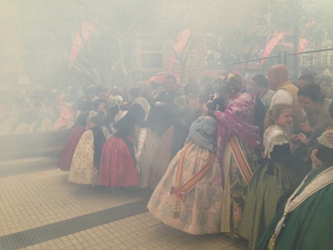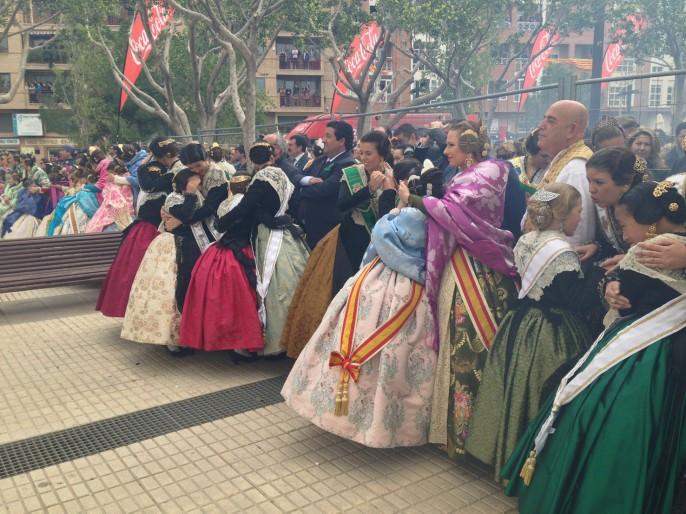 Hoy el recinto de mascletaes se vistió de color, con la presencia de las falleras mayores de Valencia y sus cortes de honor, que previsiblemente acudirán esta tarde a la ofrenda de la Mare de Deu de Lledó si el tiempo acompaña.