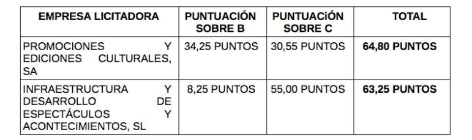 Se presentaron 2 empresas: Promociones y Ediciones Culturales SA, que pujó con 5.000 euros; Infraestructura y Desarrollo de Espectáculos y Acontecimientos SL, que ofertó 9.000. En este caso decidieron la adjudicación las propuestas técnicas relativas a la organización montaje y seguridad, entre otros conceptos y, por tanto, la instalación y explotación de la Feria de Temática Taurina se ha adjudicado a Promociones y Ediciones Culturales SA. La Feria de temática taurinas se instalará frente a la plaza de Toros