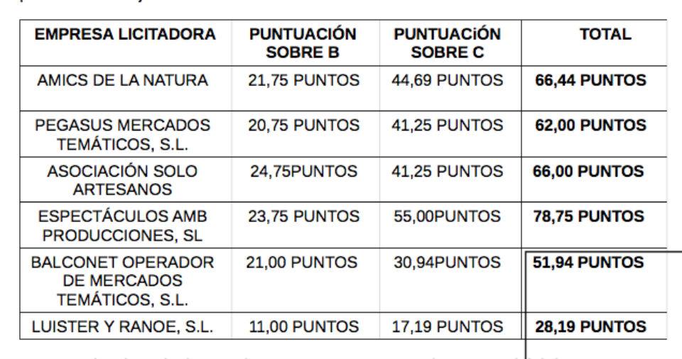 El canon mínimo estaba establecido en 25.000 euros. Se presentaron 6 empresas: Amics de la Natura, cuya oferta ascendía a 65.000 euros; Pegasus Mercados Temáticos SL y Asociación Solo Artesanos, cuya oferta llegó a los 60.000 euros; Espectáculos Amb Producciones SL, cuya oferta alcanzó los 80.000 euros; Balconet Operador de Mercados Temáticos, SL, con una oferta de 45.000 euros; y Luister y Ranoe SL, con una oferta de 25.000 euros.