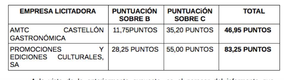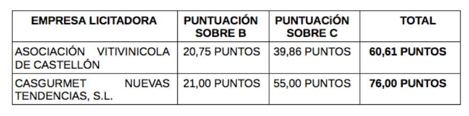 El canon mínimo ascendía a 10.000 euros. Se presentaron dos empresas: Asociación Vitivinícola de Castellón, con una propuesta de 10.146,56 euros; y Casgurmet Nuevas Tendencias SL, con una oferta de 14.000 euros. La valoración técnica fue prácticamente la misma, pero la económica no presentó dudas. Cargurmet Tendencias será quien organice este año el Mesón del Vino.