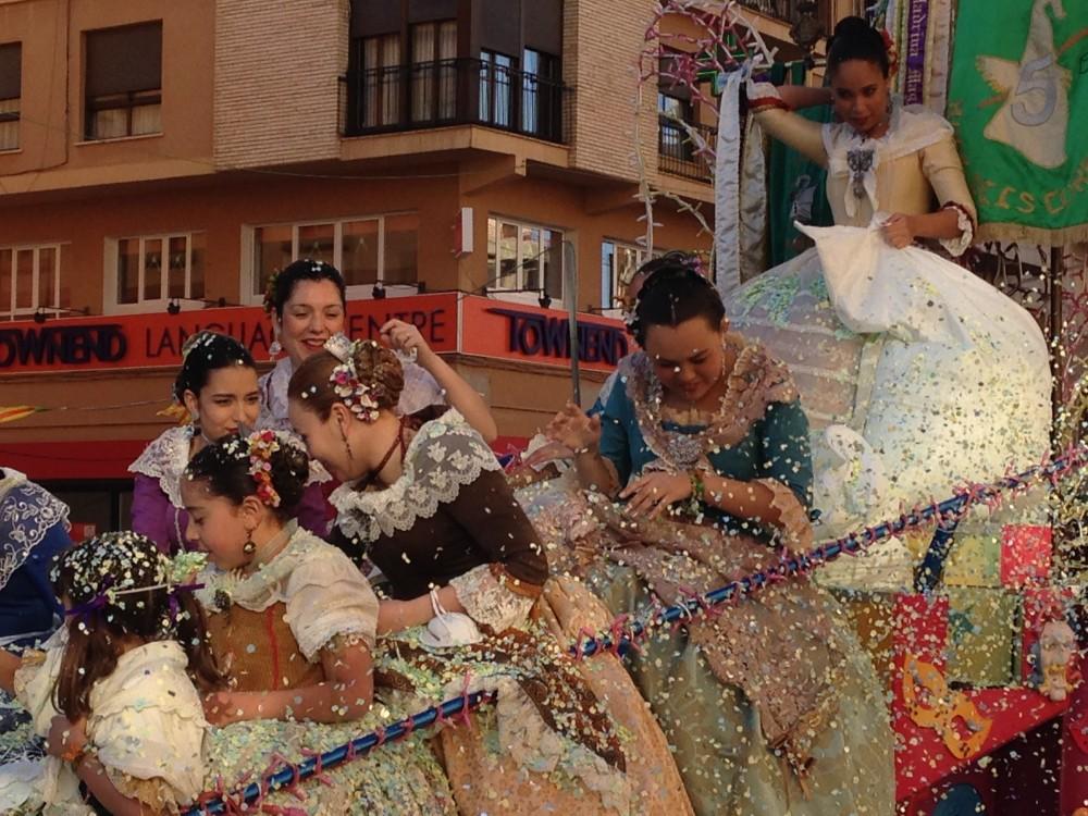Hasta la llegada de las reinas, no se repartieron los sacos de confeti entre el público, pero los niños ya habían hecho acopio de proyectiles, recogiendo desde el suelo todo lo que se había arrojado antes.