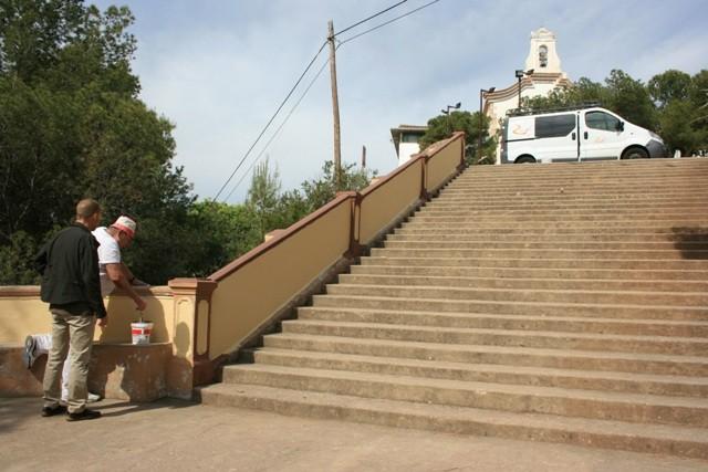 La escalinata que conecta la ermita de Santa Quitèria con el río Millars luce renovada tras la reparación de grietas y los trabajos de pintura que finalizarán mañana, a tiempo para que el paraje esté en perfectas condiciones la próxima semana con motivo de la romería. Además, la parte trasera del ermitorio también ha sido reparado y pintado para ofrecer su mejor imagen.