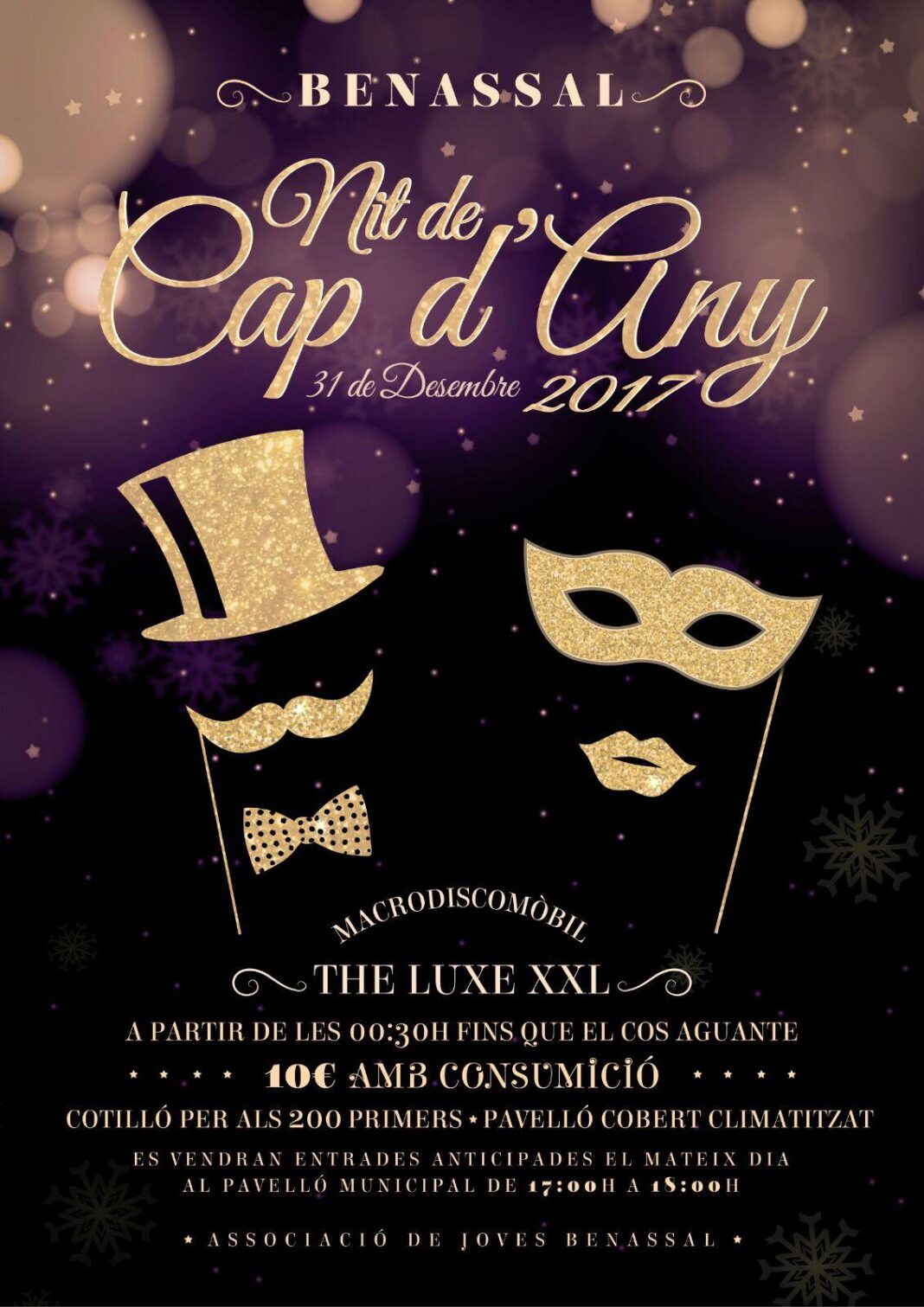 fin de año (1)La Noche de Fin de Año, vecinos y visitantes de Benassal podrán disfrutar de la macrodiscomóbil 'The Luxe XXL' en el pabellón municipal. El evento, organizado por la Asociación de Jóvenes del municipio, comenzará a las 00.30 horas y la entrada tiene un precio de 10 euros.