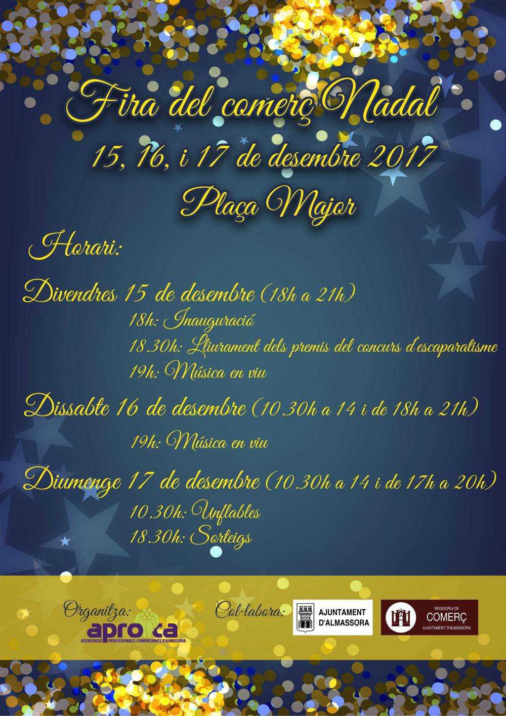 La Vila d'Almassora s'il·luminarà el cap de setmana del 15 al 17 de desembre per a la celebració de la tradicional Fira de Nadal. L'escenari triat per la Regidoria de Comerç i l'Associació de Professionals i Comerciants d'Almassora (Aproca) per a l'esdeveniment serà la plaça Major, on 15 negocis exposaran els seus productes i on el consistori situarà una caseta que donarà el servei de bar.
