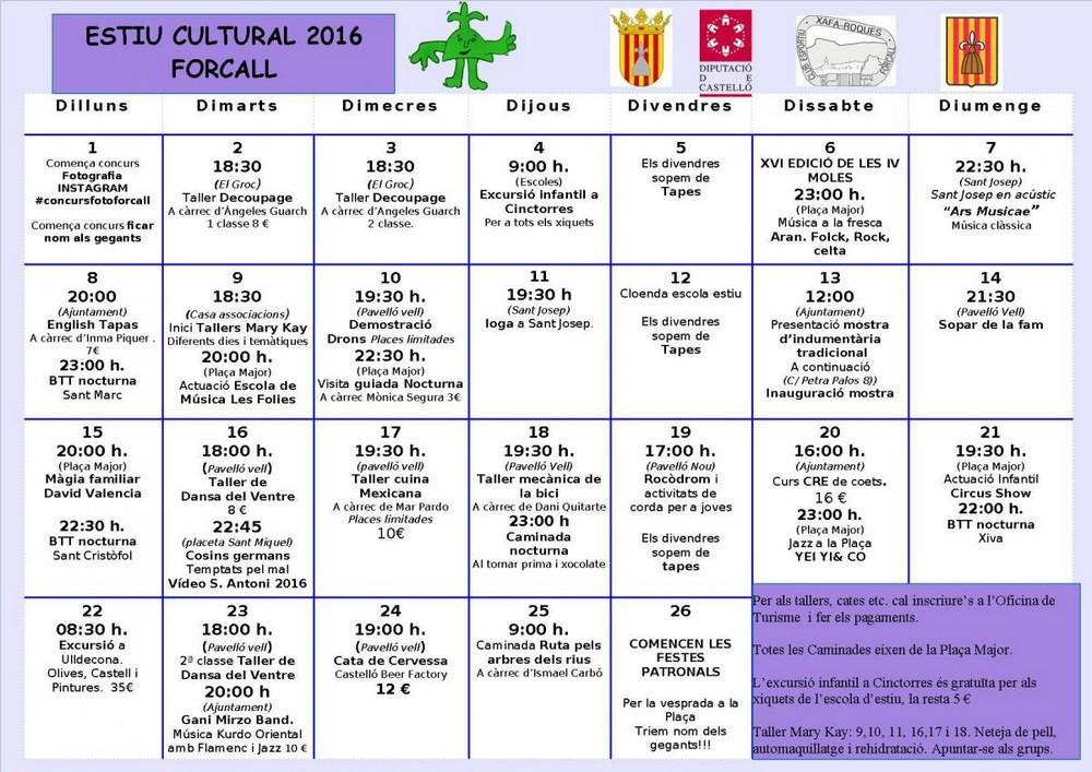 El Ayuntamiento de Forcall, con la colaboración de diferentes entidades y vecinos de la localidad, ha organizado un amplio abanico de actividades para este verano. Deporte, música, gastronomía, danza o actividades infantiles son sólo algunas de las opciones para turistas y residentes antes de que den comienzo las fiestas patronales.